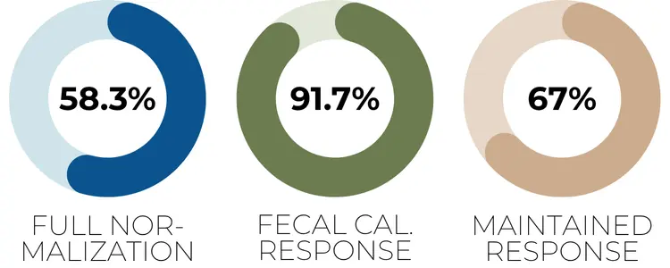 During the induction phase, patients experienced a significant improvement in disease activity, with clinical scores dropping sharply and inflammatory markers showing marked reductions. 91.7% showed improvement in their fecal calprotectin levels, a key marker of gut inflammation, and 58.3% achieved full normalization.